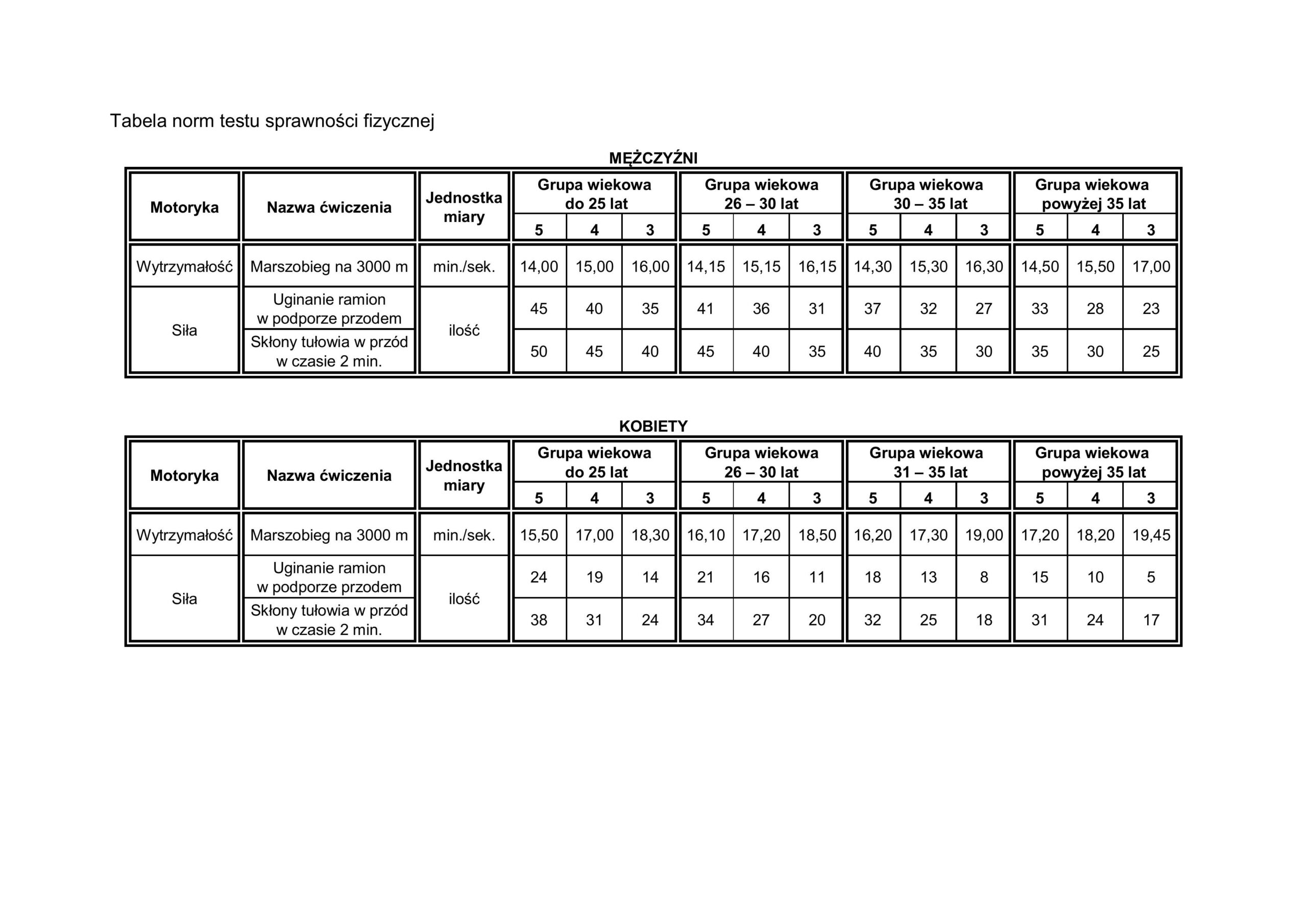 Zgodnie z rozporządzeniem kobiety i mężczyźni służący w wojsku będą na egzaminie ze sprawności fizycznej wykonywać te same ćwiczenia. Od tego roku i kobiety, i mężczyźni będą przechodzić egzamin na dystansie 3000 metrów (nadal będzie to opcja do wyboru obok pływania). W grupie od drugiej do piątej wymagania dla kobiet będą o ok. 12 proc. łagodniejsze niż dla mężczyzn, wyjątkiem jest grupa pierwsza – tu normy dla kobiet i mężczyzn są takie same. Ponadto, dotychczas żołnierze kobiety wykonywały pompki na ławeczce, teraz tak jak i mężczyźni będą mogły wybrać podciąganie się na drążku. Takie same dla obu płci będą też konkurencje testujące zwinność i sprawność – kobiety zamiast biegu zygzakiem będą mogły wybrać bieg wahadłowy 10 x 10.
